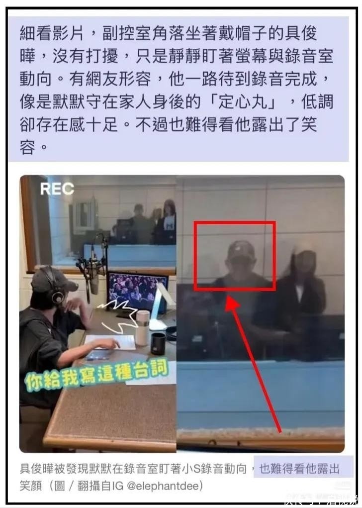 据台湾媒体最新披露,小S复工首日便有特别身影相伴——姐夫具俊晔全程随行,陪伴其进入录音棚。当天画面温馨感人:具俊晔头戴一顶素色鸭舌帽,装扮极为低调,安静地坐在录影室内,目光始终聚焦在小S身上,神情专注而温柔,给予她莫大的精神支撑。