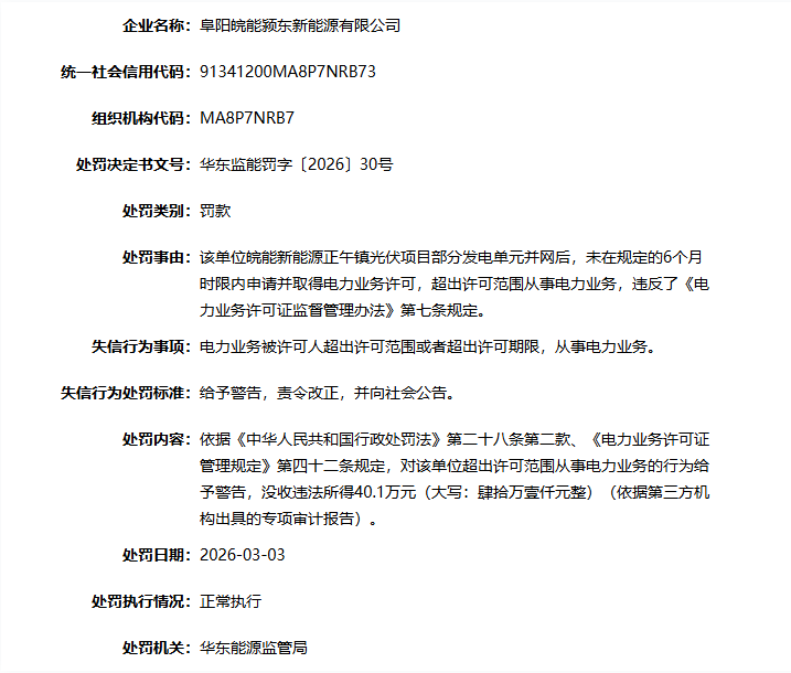 超期未取得电力业务许可,阜阳皖能颍东新能源被罚40.1万