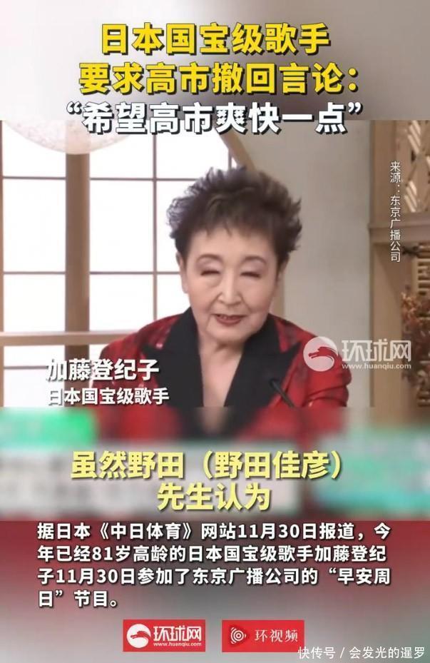 11月底,日本东京广播公司一档晨间节目里,81岁的国宝级歌手加藤登纪子语气平静却坚定地说:“我希望高市首相能明确撤回她的发言。” 这话听起来简单,却像一颗小石子,轻轻一丢,就搅动了本就不太平静的日中关系湖面。 事情得从11月7日说起。那天,日本首相高市早苗在国会答辩时抛出一句:“台湾有事可能演变为日本的‘存亡危机事态’。”话音刚落,中方立刻强烈抗议,日本国内也炸开了锅。而真正让这场风波从政坛蔓延到普通人心里的,不是哪位议员或专家,而是像加藤登纪子这样的文化人——他们不靠选票吃饭,只凭良知和记忆说话。
