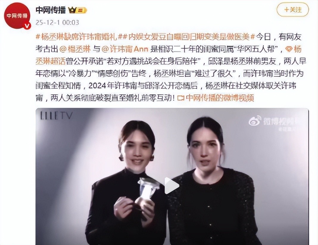 然而,这份圆满之中仍有一丝遗憾挥之不去——杨丞琳并未现身许玮甯人生最重要的日子之一。这对自华冈艺校时期便形影不离、被外界称为“铁三角”成员之一的好姐妹,终究没能并肩走到这一天。