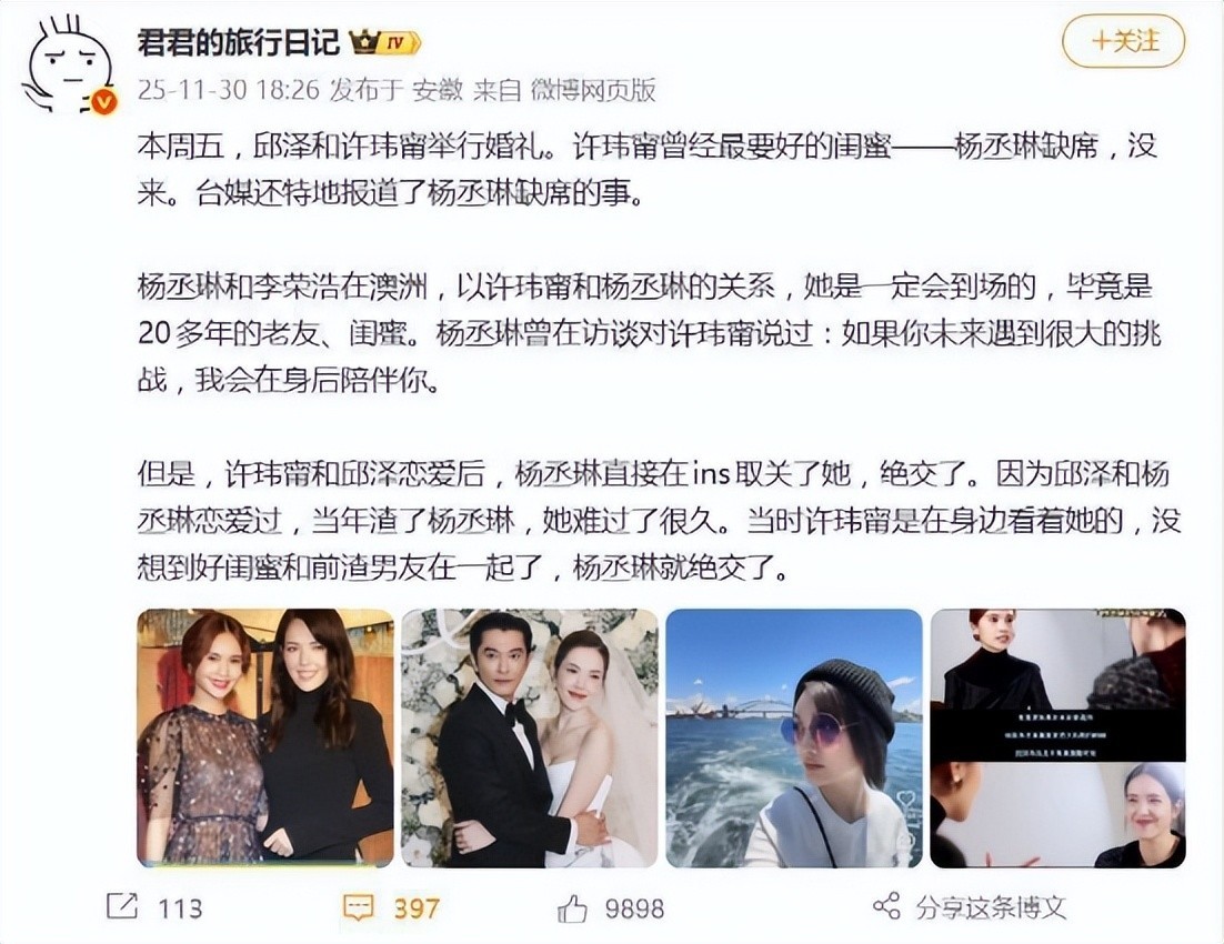 在邱泽与许玮甯举办的这场补办婚礼上,现场布置温馨动人,430位嘉宾齐聚一堂,星光闪耀,共同见证这对新人的幸福时刻。可就在众人祝福声中,一个名字格外沉默——杨丞琳的缺席,成了整场盛典中最引人注目的空白。