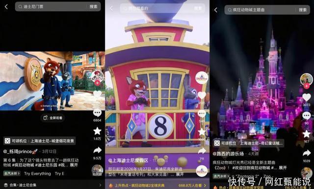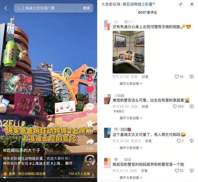 活跃的创作力背后,还必须提及的是技术的加持,剪映推出了“和狐兔cp合照”、片头转场等模版,极大地降低了的用户参与的技术门槛。 而在海量《疯狂动物城2》相关的短视频内容中, 围绕上海迪士尼度假区同款主题乐园创作的内容,热度尤其凸显。 百万粉颜值达人@Datgirl发布“角色到线下同款场景”的转场视频点赞高达5.9万,此外,@惟余莽莽、@滨不远、@唱姐等达人发布的转场视频,点赞也都过万,#在上海迪士尼拍到了人生转场话题还登上抖音上海同城榜TOP1,有超过110万人在看。 该IP的线上热度之所以能带动线下的热度, 除了内容本身,也离不开上海迪士尼的主动经营。 根据最新剧情,上海迪士尼度假区也同步更新了装置、推出了全新活动。不定时出现的盖瑞一条蛇、身着狐兔最新礼服的NPC、主题曲现场......这些影片中印象深刻的角色和情节,也在线下实现复刻,很多看完电影的用户迫不及待想走进线下,沉浸式感受《疯狂动物城》的魅力。 有人汇总出了《疯狂动物城2》上映后上海迪士尼度假区的变化,有人晒出了角色互动和城堡特殊投影,用户纷纷留言,“昨天我在里面玩儿的可开心了”、“完全是心中的乌托邦”、“去过一次真的会和做梦一样”。