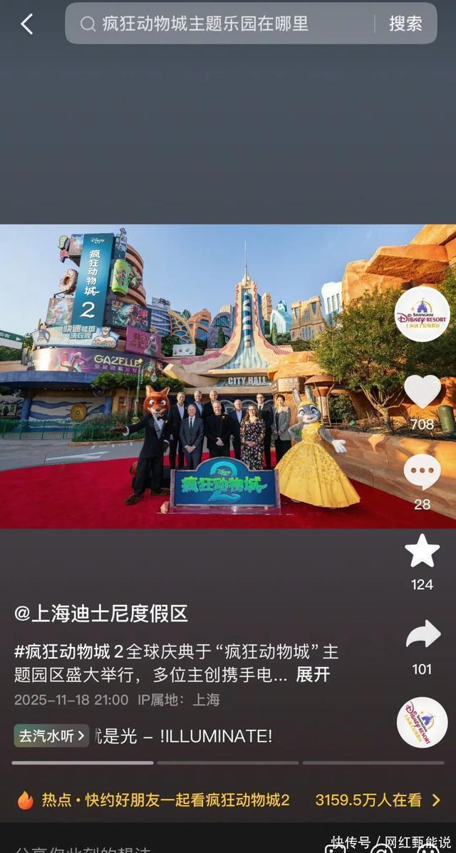 作者|豆芽 时隔九年,《疯狂动物城2》携经典IP的情怀沉淀与全新冒险故事回归,未映先火的热度点燃全球粉丝的期待。 11月26日正式上映后,无数老粉揣着对朱迪、尼克的记忆奔赴影院,再度踏入那个温情与勇气并存的动物世界。虽然间隔了九年时光,但“包容与成长”的内核贯穿始终,而随着观众的成长与IP的沉淀,以及内容创作和消费的便捷,反倒让用户与IP、角色之间的距离愈加靠近。 娱乐资本论观察到有趣的现象, 电影热映的同时,抖音上也掀起一场卷动大量用户参与的《疯狂动物城2》创作热潮。 有人跟风动物城音乐节主题曲发起舞蹈challenge、翻唱演绎;有人翻出上海迪士尼度假区《疯狂动物城》主题园区打卡vlog重温回忆;更有创意达人借助AI技术实现与朱迪、尼克的跨次元合影,或制作脑洞大开的转场视频......