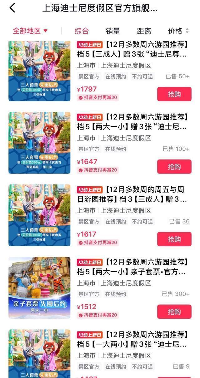 内容与共鸣外,上海迪士尼度假区如何接住IP商业流量? 治愈系拉满的影片内容、与线上话题的发酵,尤其是同款主题乐园的线下打卡,成功吸引了很多刚走出影院、甚至还没有看影片的用户,对“走进电影”的期待。 但如何把转瞬的情感共鸣、分散在全国各地的用户,转化为线下实实在在的客流,还需要官方再添一把力。 @上海迪士尼度假区官方旗舰店抓住用户旺盛的体验需求, 提前搭配好了多个团购套餐,针对多人出行、亲子出行、学生出行、周六、特定工作日等多个人群、消费场景,给出了适配的消费选择方案。 “先囤后约”的模式,对于消费者而言更灵活,尤其是外地的粉丝使用起来也更方便。